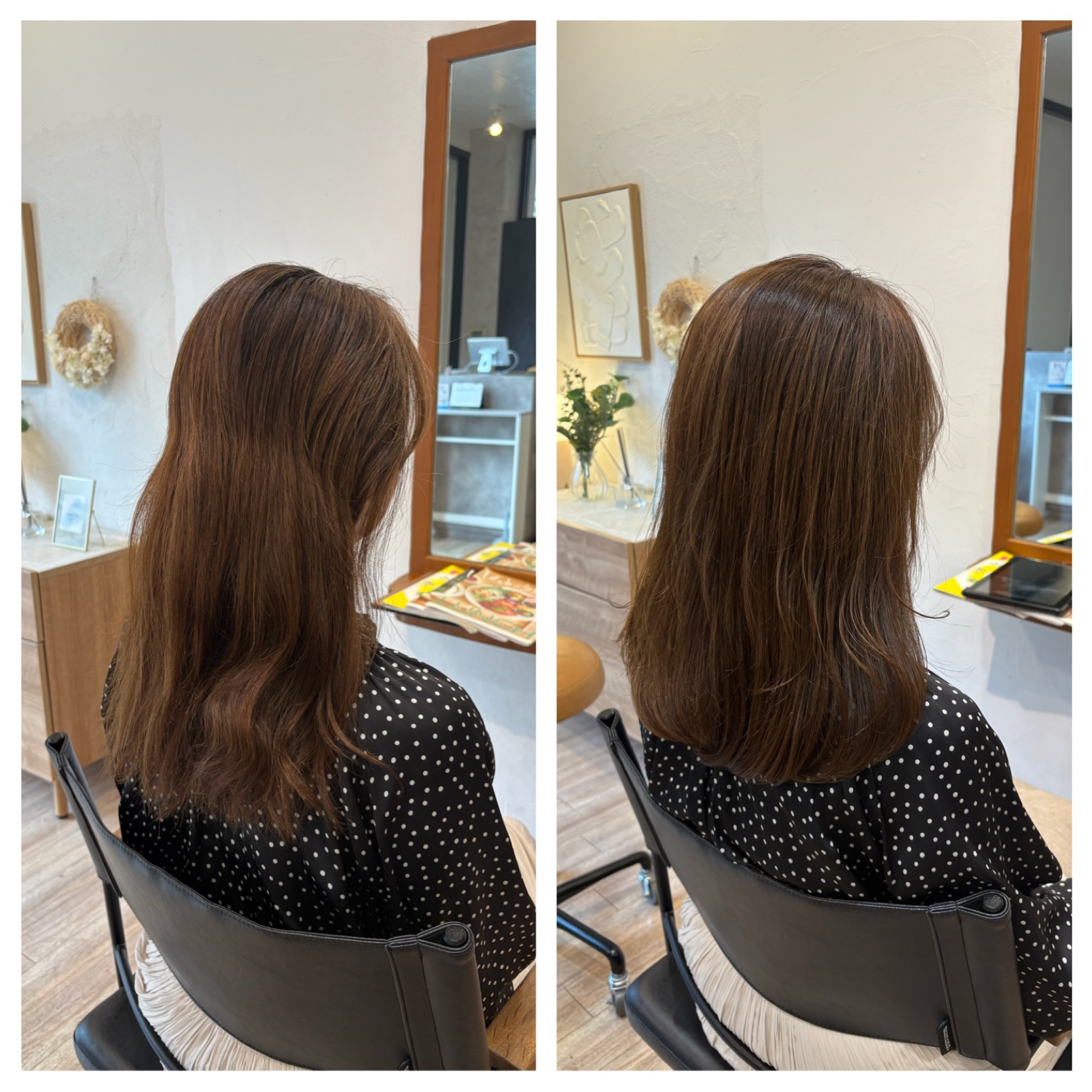 高知店のカラーエステの施術実績 【パサつき広がる髪が、艶々まとまる髪に】 dearskouchi 2025年10月26日 皆様こんにちは^ ^ ディアーズです♪ 本日はカラーエステのお客様の事例をご紹介します。 ご来店時、パサつき、広がりがお悩みでご相談いただいたお客様。 原因は、クセとダメージでした。 当店のカラーエステは、天然の栄養成分でできたトリートメントを 髪の毛にたっぷりといれながら施術していくことで 髪の毛への負担を最小限に抑え、髪内部から潤いを与えていきます。 写真のように、乾かすだけで 艶々まとまる綺麗な髪になりました。 お客様からも「艶々〜」とお喜びいただけました♪