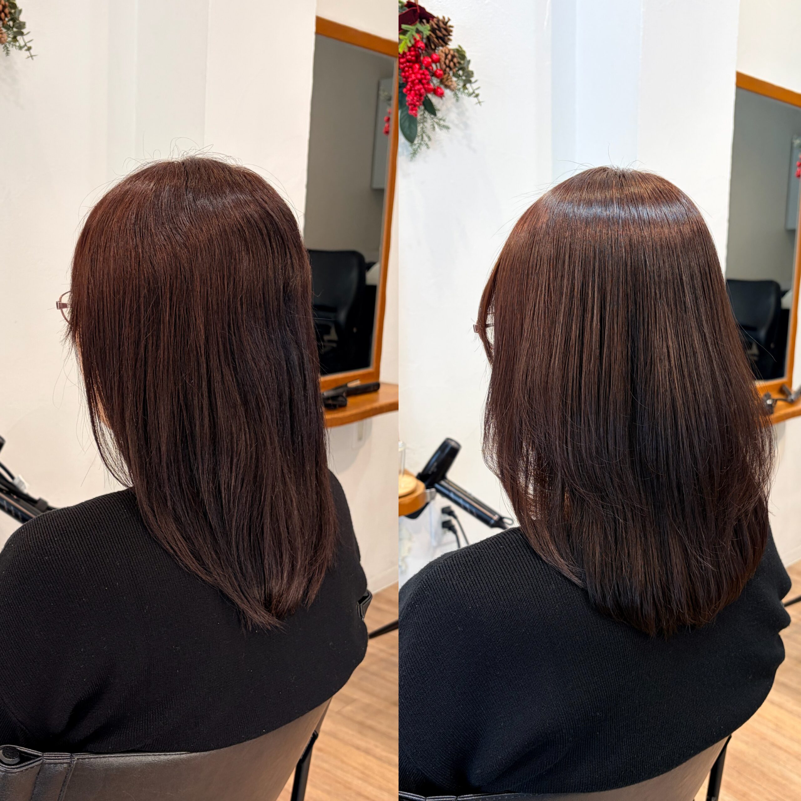 高知店のストレートエステの施術実績 【うねり、広がる髪が、艶々まとまる髪に】 dearskouchi 2025年12月15日 皆様こんにちは^ ^ ディアーズです♪ 本日はストレートエステのお客様の事例をご紹介します。 ご来店時、うねり、広がりがお悩みでご相談いただいたお客様。 原因は、クセとダメージでした。 当店のストレートエステは、天然の栄養成分でできたトリートメントを 髪の毛にたっぷりといれながら施術していくことで 髪の毛への負担を最小限に抑え、髪内部から潤いを与えていきます。 写真のように、乾かすだけで 艶々まとまる綺麗な髪になりました。 お客様からも「艶々〜」とお喜びいただけました♪